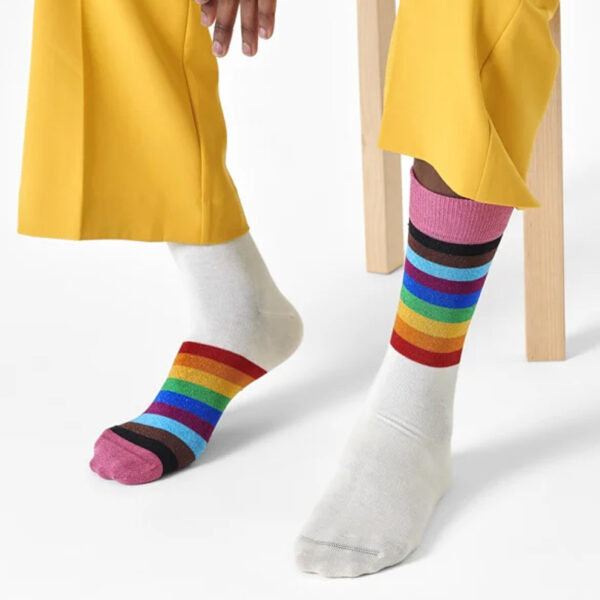 Πάντα να περπατάς με περηφάνια! Ο σχεδιασμός μας Pride Rainbow δείχνει ολόκληρη την πολύχρωμη σημαία ουράνιου τόξου σε glitter, υπέροχα αταίριαστη – εμφανίζεται στον άξονα στο ένα πόδι και στο κάτω μισό στο άλλο. Έχει ενημερωθεί για να είναι πιο περιεκτικό, εμπνευσμένο από το σχέδιο Progress Pride Flag του Daniel Quasar. Τώρα σε ασορτί σχέδια σε παιδικά και ενήλικα μεγέθη. Δεσμευόμενοι να υποστηρίζουμε την κοινότητα LGBTQIA+ όλο το χρόνο, το 10% των καθαρών πωλήσεων από όλα τα προϊόντα μας που σχετίζονται με το Pride που πωλούνται θα διατεθούν στην InterPride, τη διεθνή ένωση όλων των διοργανωτών εκδηλώσεων Pride παγκοσμίως.