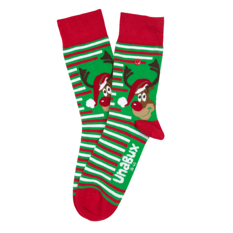 Νιφάδες χιονιού και λευκές κάλτσες ήταν χθες. Το UnaBux κάνει τα Χριστούγεννα φρέσκα! Αγαπάμε τα έντονα χρώματα και τα υπέροχα σχέδια – όλο το χρόνο. Το τρίξιμο κίτρινο με μοτίβο φοίνικα πηγαίνει εξίσου στην εποχή της έλευσης όπως ένα κύμα καύσωνα την παραμονή των Χριστουγέννων. Τα χρώματα των νέων χριστουγεννιάτικων κάλτσων ταιριάζουν πολύ καλύτερα: κόκκινο, λευκό, μπλε και έλατο, με χιόνι και gingerbread man ή το υποχρεωτικό Rudi. Τα Χριστούγεννα είναι ασφαλή! Όπως και στα κλασικά μας, έτσι και το σήμα κατατεθέν μας δεν πρέπει να λείπει από τη χριστουγεννιάτικη συλλογή: το μικρό κόκκινο κουμπί. Γιατί μας αρέσουν οι λεπτομέρειες.