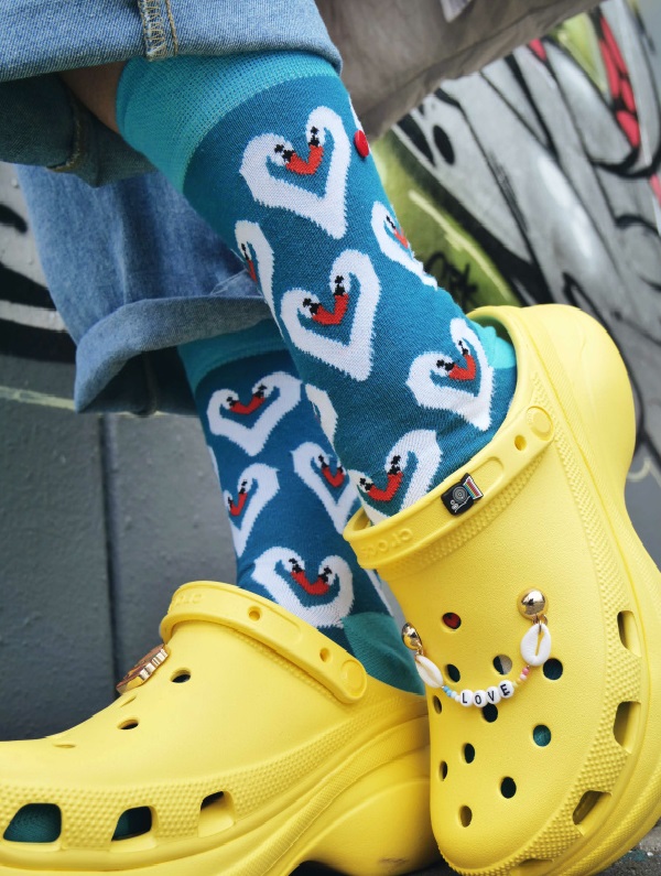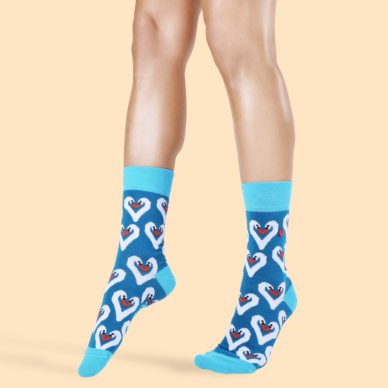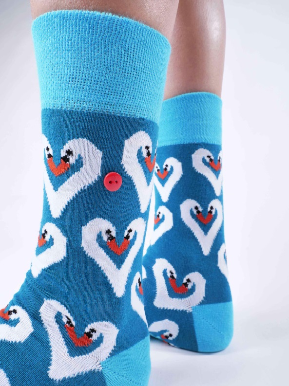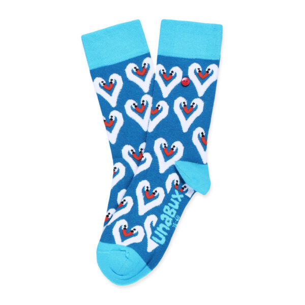 Ω αγαπητοί κύκνοι, αχ, κύκνοι! Δύο μακρύι λαιμοί ενώνουν τα κεφάλια τους στο μοντέλο κάλτσας UnaBux SWAN COMBO σε μια γλυκιά καρδιά και προσφέρουν λίγη αγάπη στα βατραχοπέδιλα. Μπλε φόντο της Λίμνης των Κύκνων και γαλάζια δάχτυλα με μανσέτες και ήδη περπατάτε κομψά στη λίμνη της ζωής. Νακνάκ!